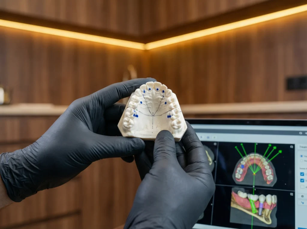 Диагностика занимает 30–40 минут. Делаем 3D-снимок на томографе Planmeca, анализируем с помощью ИИ Diagnocat — находит кариес от 0,5 мм, кисты от 2 мм, трещины корней и атрофию кости с точностью 94%. Сканируем зубы интраоральным сканером Planmeca — цифровая модель за 5 минут без неприятных слепков. На 3D-сканере лица RAYFace показываем как будет выглядеть улыбка после лечения ещё до начала работы.